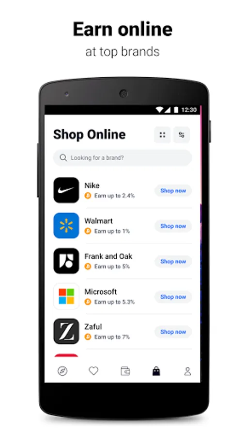 Earn online: Simply tap a brand and shop at that brand as usual. You'll automatically receive Bitcoin after each eligible purchases. Simple, right?