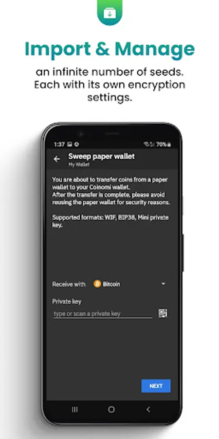 •Multi-seed support: Store and manage multiple accounts in the same app, each with its own encryption settings for maximum convenience.