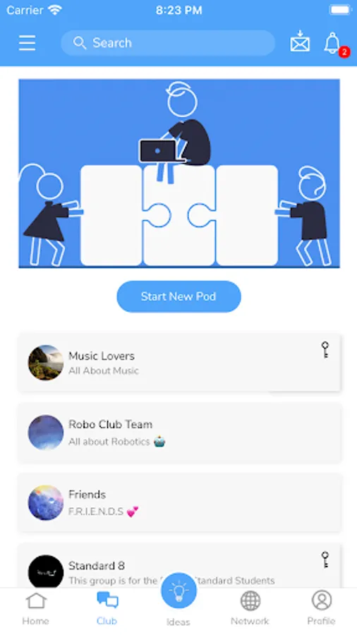 Great place to make interest based clubs. Students can interact/engage within their own secure social chat groups called PODS by exchanging text messages, "likes", "comments" or by starting video conversations. Content filters are enabled to make the conversations child friendly.