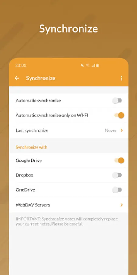 Supports synchronize with Google Drive, Dropbox, Microsoft OneDrive and WebDAV Server.