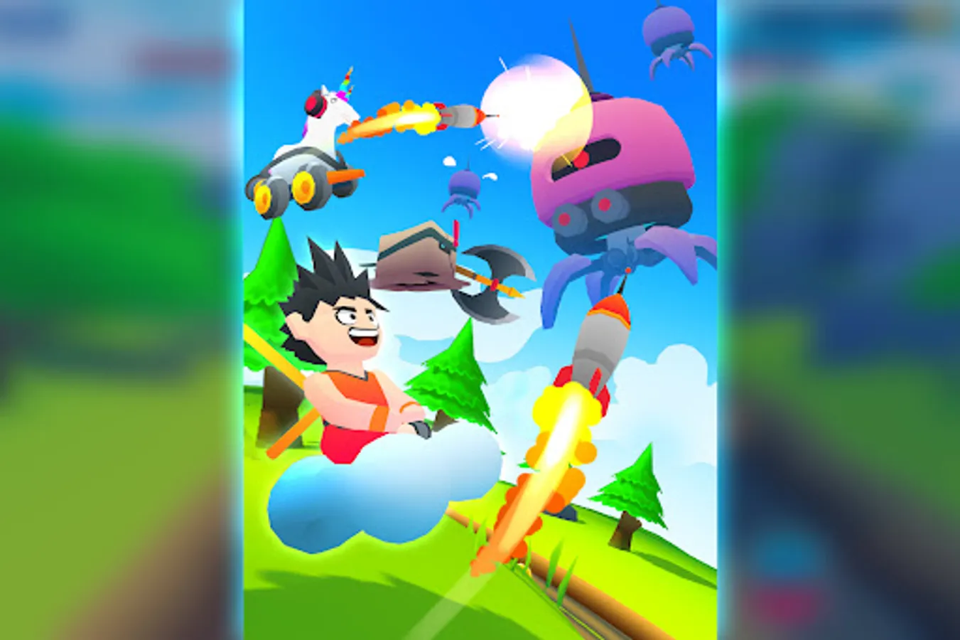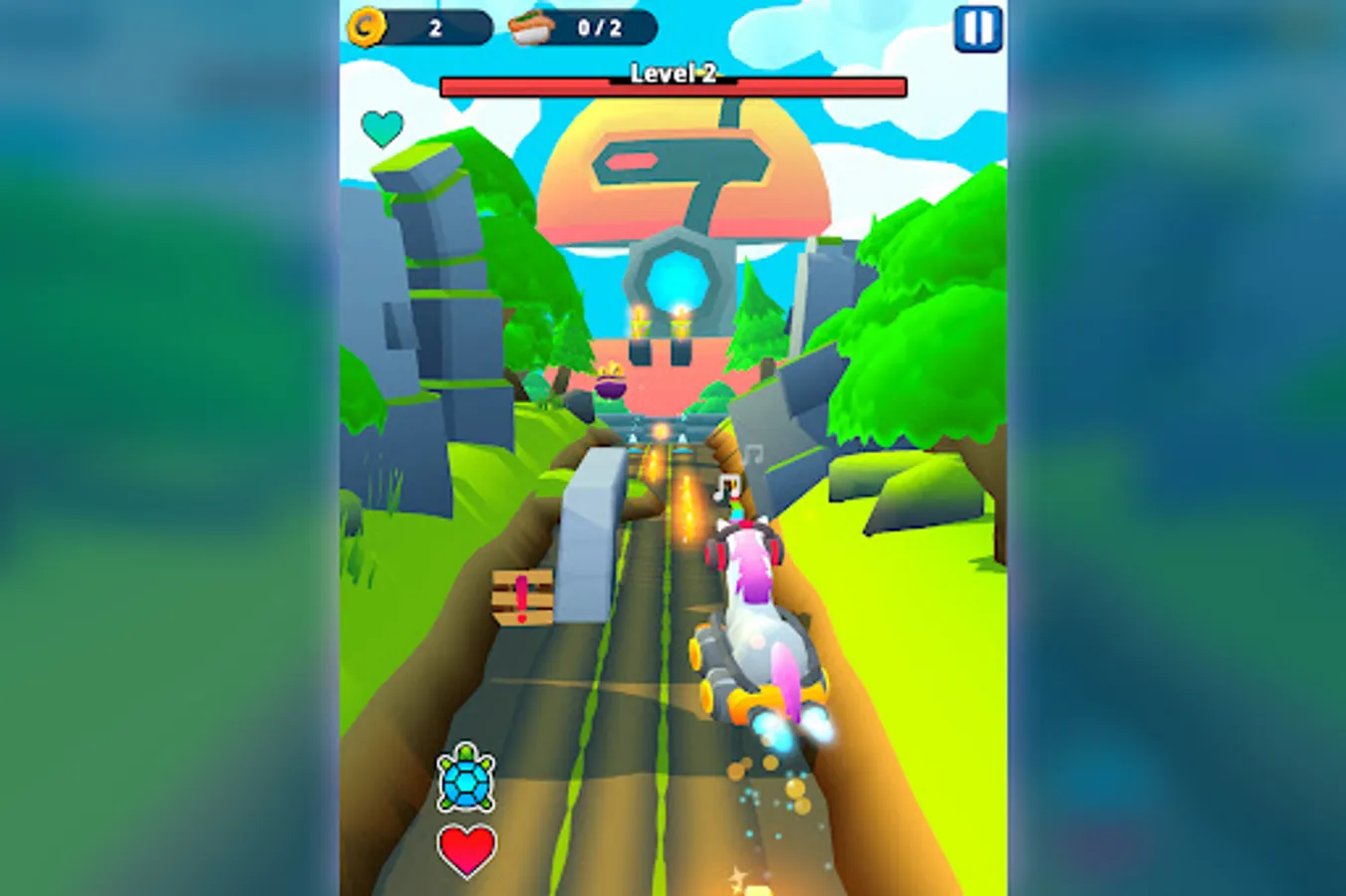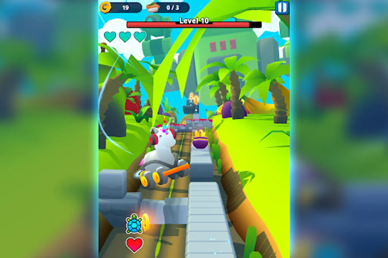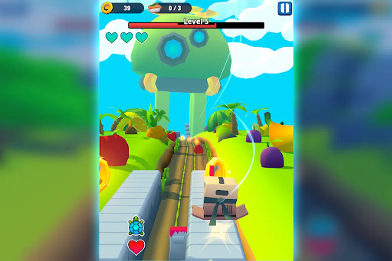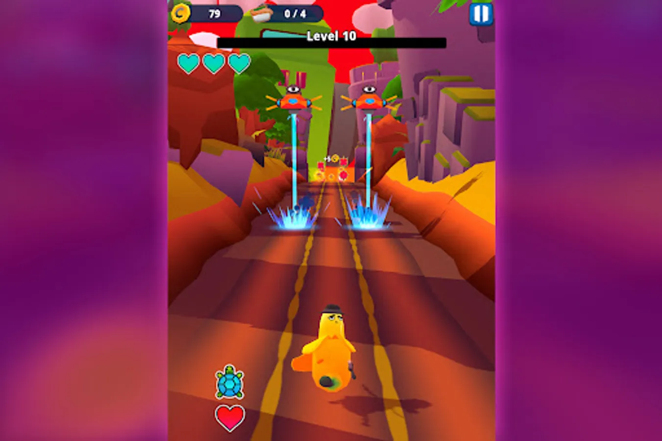 Choose your runner from a group of hilarious characters and chase the Agency Bosses. Run through a world filled with dangerous obstacles and boss attacks. Jump, slide and dodge to avoid everything that comes your way. Avoid hitting mines, fruits, rockets and much more. Run and explore exotic locations while playing as a crazy unicorn, a cloud surfer monk or a fedora wearing banana. Use the runners‘ unique perks to get bonuses and adjust the way you play. Use your focus and reflexes to collect coins and use them to level up your weapons and runners to become stronger.