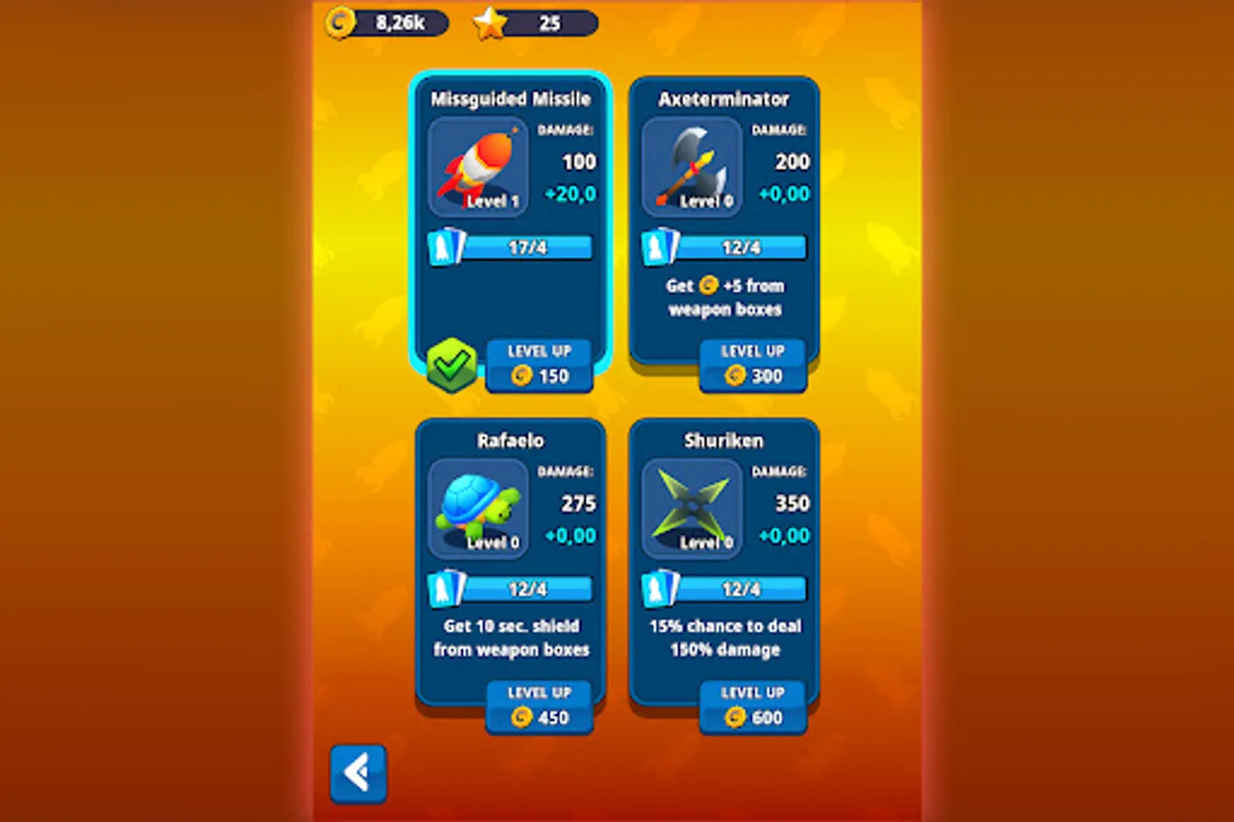 Collect crates with weapons on the road, to damage the boss. Every weapon has a unique perk and can be upgraded.