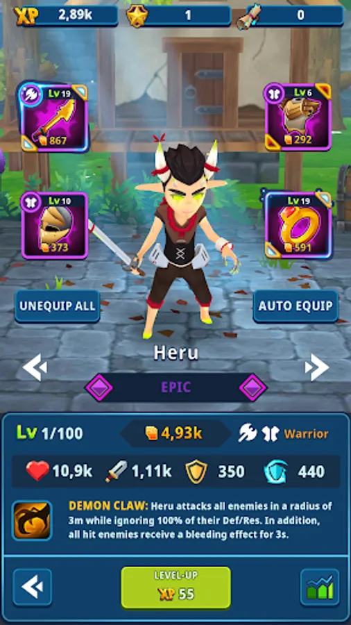 Use summoning scrolls to unlock rare fantasy heroes through the summoning portal and gather experience points to upgrade their levels. Try to unlock the legendary heroes of Idle Dungeon Manager to unleash your full potential. Collect different classes like warrior, archers, mages, and many more.