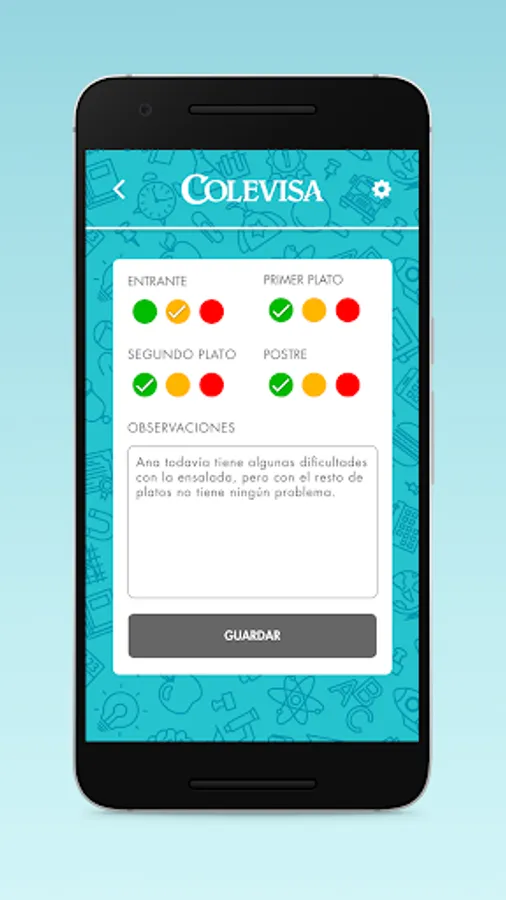 Rate dining: This functionality is very fun, when the student finishes eating, the teacher can rate as he has eaten with a level of scoring that is based on establishing colors (Red: Bad, Yellow: Regular, Green: Good), you can also Add a comment for the father / mother to see and be calm.