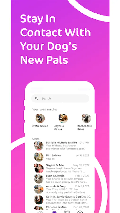 Find your pack! Looking to meet with like minded people who love their pets like you do? Look no further! Our matching works just like your favourite meetup apps. Swipe right on pups you like, left on those you don’t. Once you’ve matched with them, you can chat freely as much as you want, for free. We do NOT believe in pay to message (who wants to do that?)