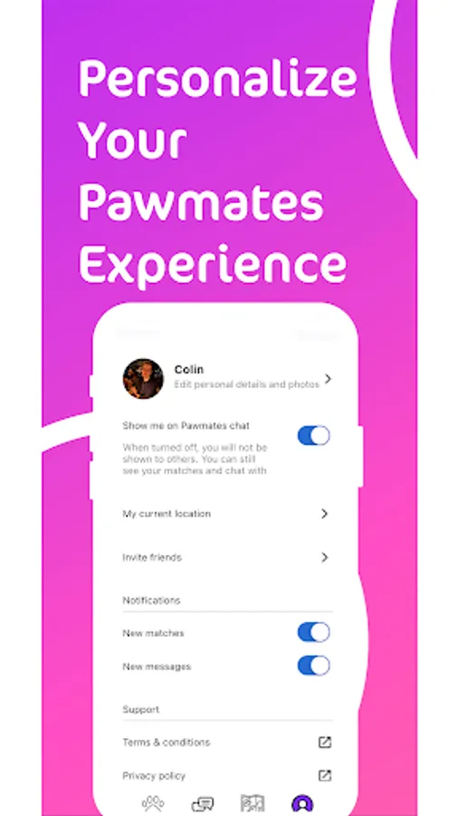 Pawmates matches show up on your custom wheel! Swipe through your match wheel and start chatting with people and their pups!