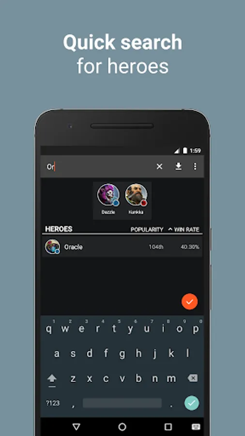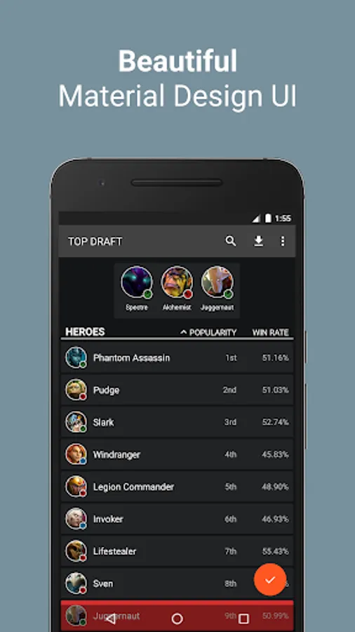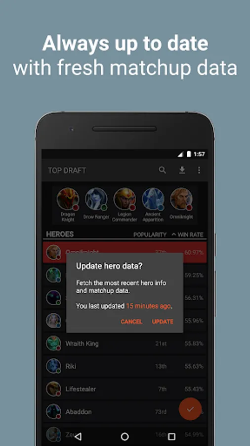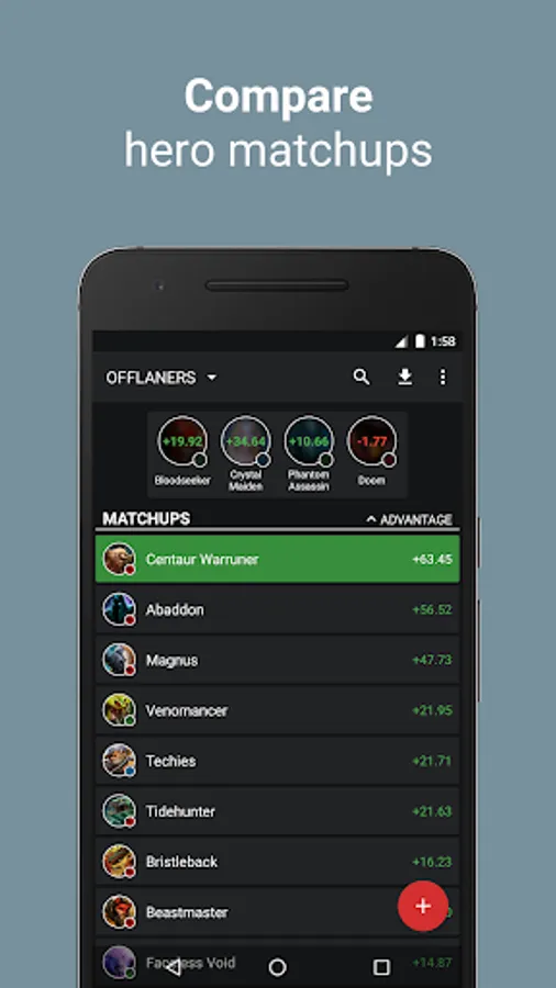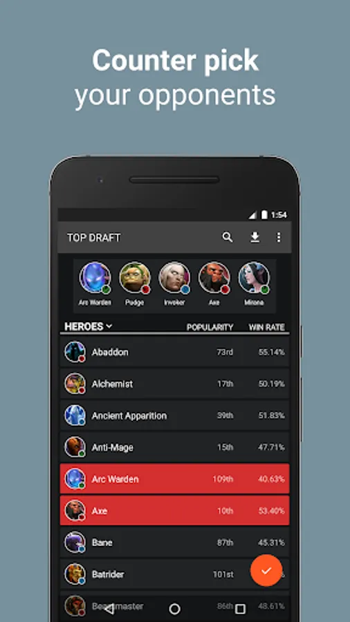 Find the best counter picks as well as heroes to avoid. No wishy-washy opinions here - only hard stats! The app's hero matchup database can be updated any time so you always have the most recent data. All of this functionality is wrapped in a beautiful, performant Material Design user interface!