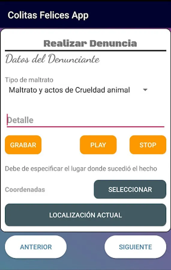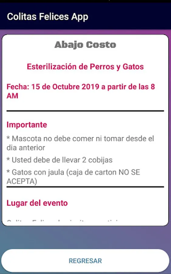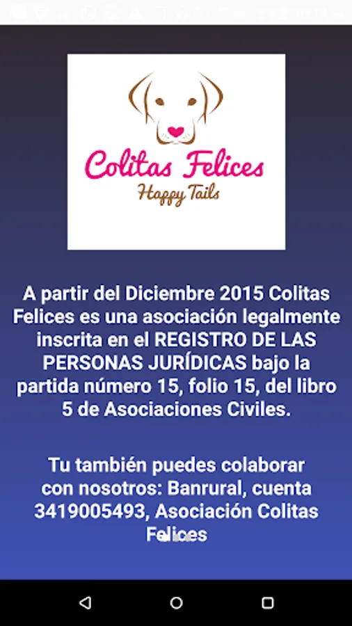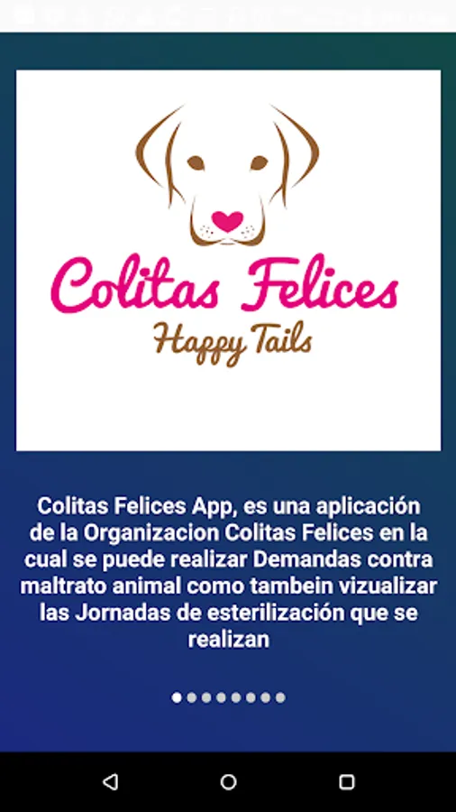 Colitas Felices App is an application developed by the Colitas Felices Institution to provide social assistance in the area of Quetzaltenango and its surroundings with the Sterilization Days for dogs and cats to try to reduce their over population in the areas of Quetzaltenango, Similarly, the App offers the option of generating lawsuits against animal abuse thanks to Decree 05-2017 of the Republic of Guatemala.