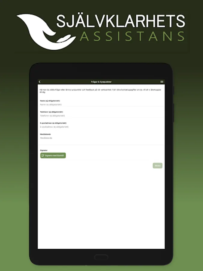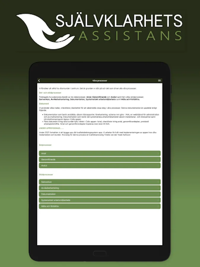 Needless to say Assistance in Helsingborg works with personal assistance for children and adults according to the LSS (Law on Support and Service for some Disabled People). With the help of the app we can structure and follow up our quality management system in a simple and user-friendly way. The app will also be used to collect all documentation about each individual user. Relatives and other stakeholders can keep up to date on news, ask questions and provide feedback and feedback.