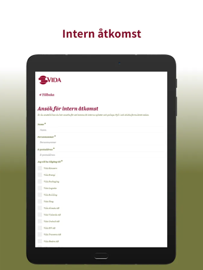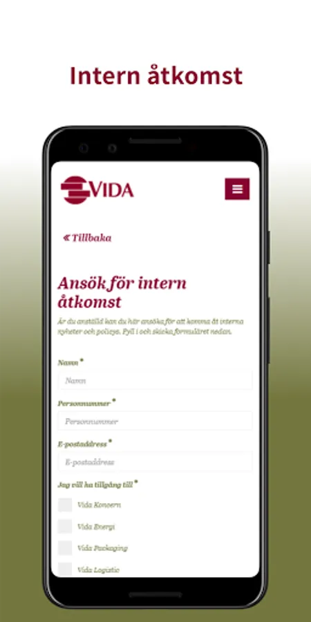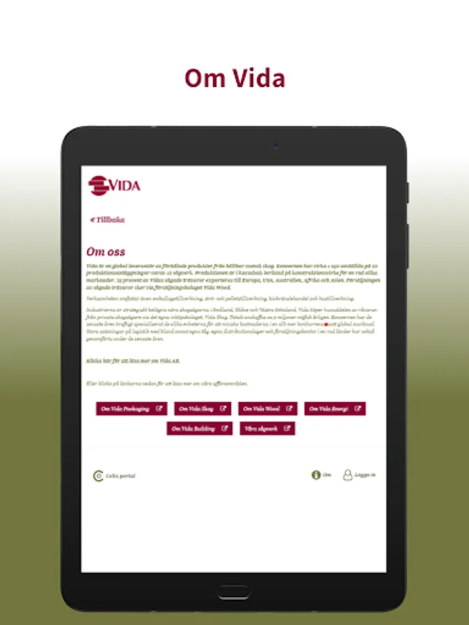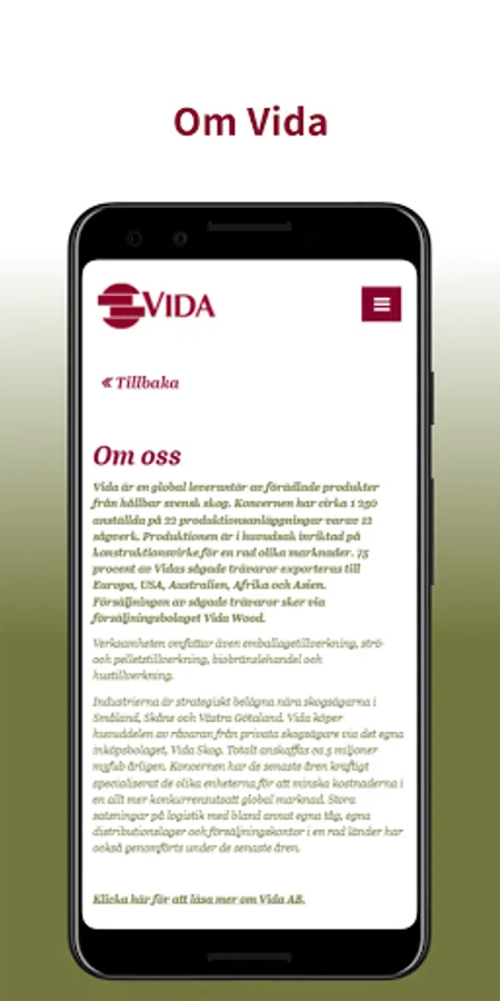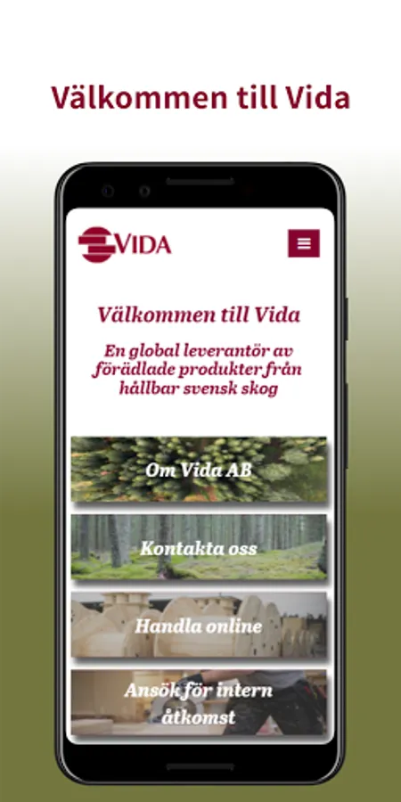 Vida is a global supplier of processed products from sustainable Swedish forests. Via our app, our customers can, among other things, find info about us and order online. Our employees also have access to internal news.