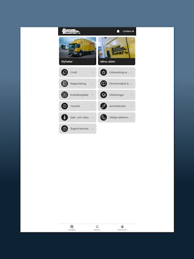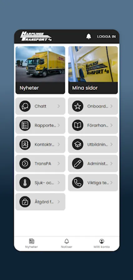 In the app for Harplinge Transport AB, you as an authorized person can take part in a simplified working day by e.g. various digital documents and checklists. You can also take part in information flow, policy documents, contact details and much more.