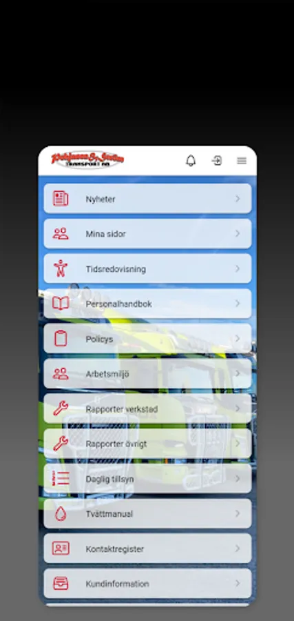 In the app for Pohjanen & Ström Transport, you as an authorized person can take part in a simplified working day through, among other things, various digital documents and checklists. You can also take part in information flow, forms, contact details and much more.