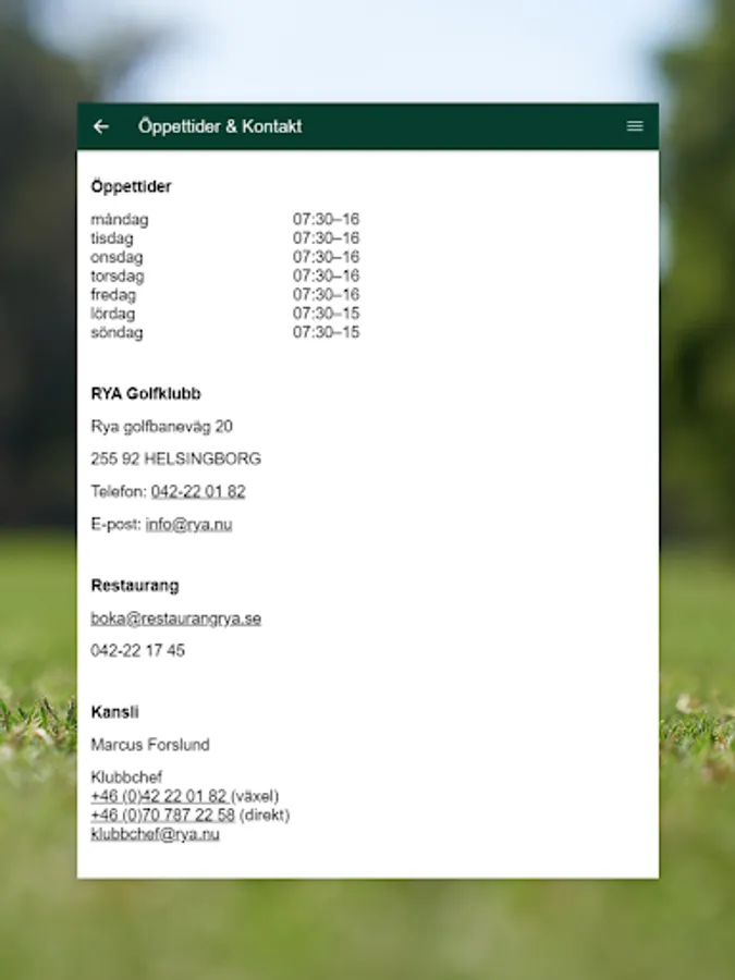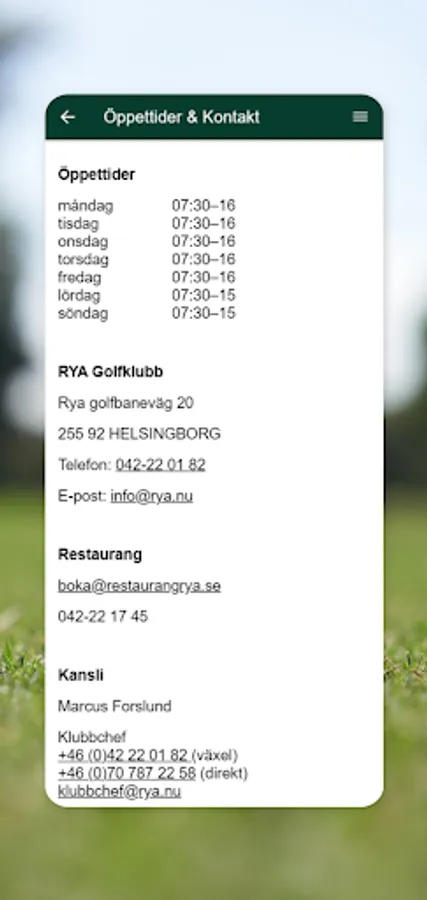 With the app for Rya Golf Club, you as a member can access important information via push notifications. You can follow what is happening at the club via news feeds, book a golf lesson, read more about our courses, take part in information about our restaurant, opening hours and much more.