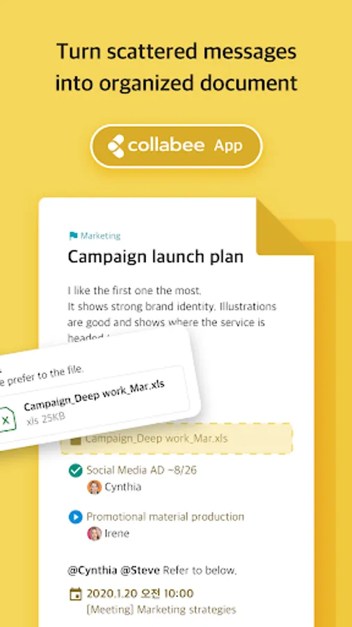 The main difference of Collabee Messenger is that messages are turned into documents on Collabee App with just a few click. You can select important messages and files, links and convert the conversation into note on Collabee App. Without loosing any messages and file, you can seamlessly collaborate with team.