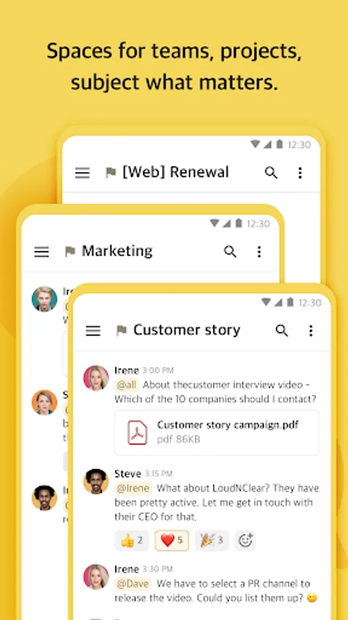 When you already signed up 'Collabee App' which is a team collaboration tool, all spaces in 'Collabee Messenger' automatically will be synced with spaces created on 'Collabee App'. You can continue to make a conversation on the same space with same colleagues. You can also manage 1:1 chat and group chat.