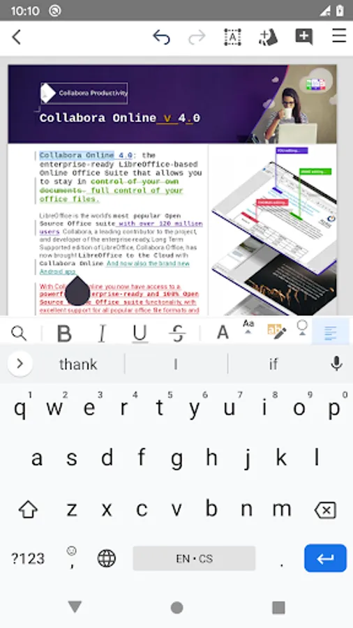 Collabora Office is a text editor, spreadsheet and presentation program based on LibreOffice, the world's most popular Open Source office suite - and now it's on Android, enhancing your possibilities to work on mobile and for collaboration.