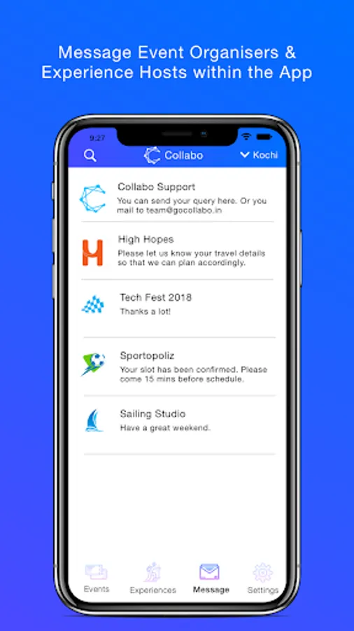 Talk to event organisers and other businesses directly within the Collabo app. This feature can be used to order product or services, customer support and for enquiries.