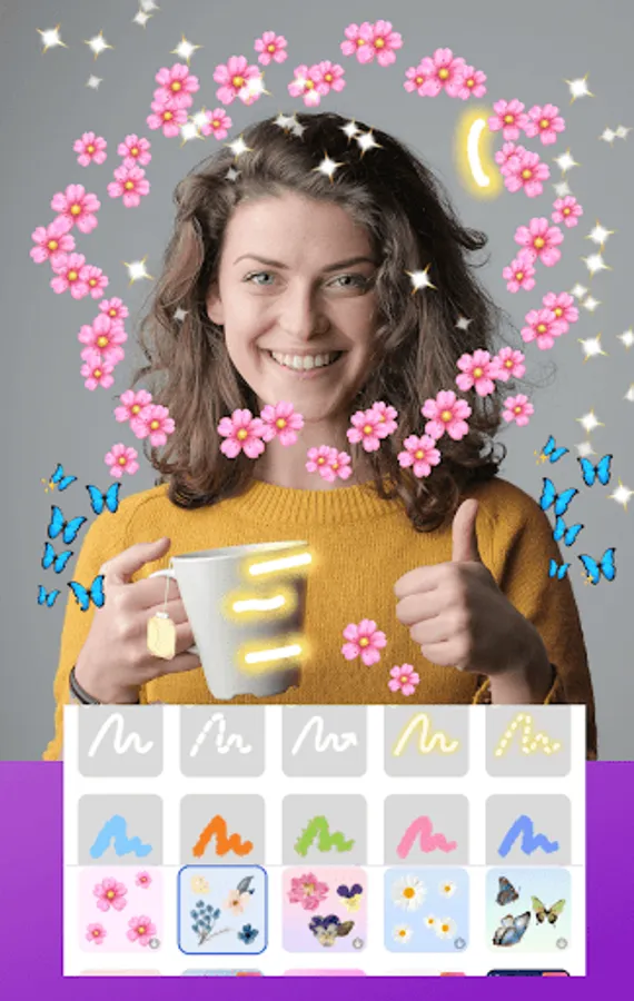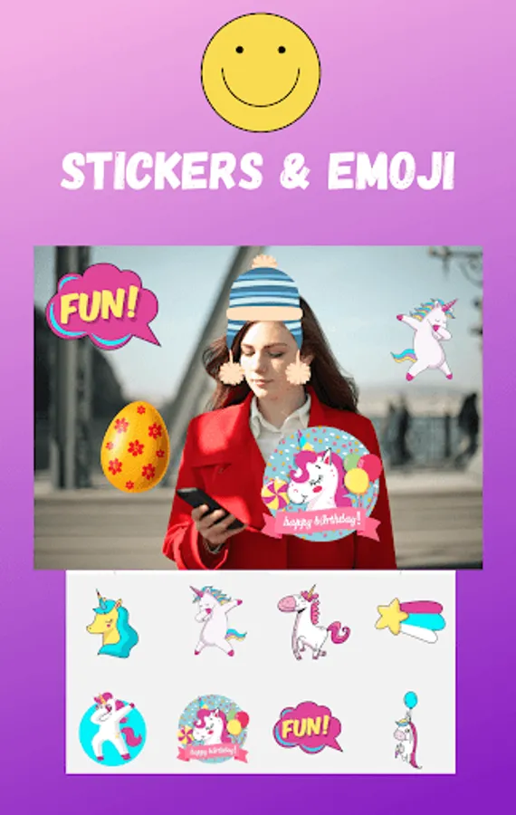 - Add stickers, text, backgrounds, graffiti, borders, and frames