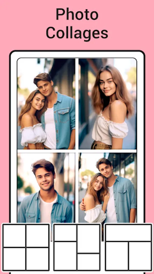 📷 In this photo collage maker app will be able to create collages with your favorite pictures. Choose the pictures and then insert them in the desired collage. Choose the format you want: vertical, square, horizontal. We have a large list of collages from which you will surely find something you like. Add backgrounds that can be of different colors, gradients, or special backgrounds. Edit your photos, collage borders, add texts, emoji and stickers and save the composition you created. Share it with your loved ones, or post it on one of the social networks such as Facebook, Instagram, TikTok, Whatsapp, Telegram etc. You will also be able to use it as a story maker.