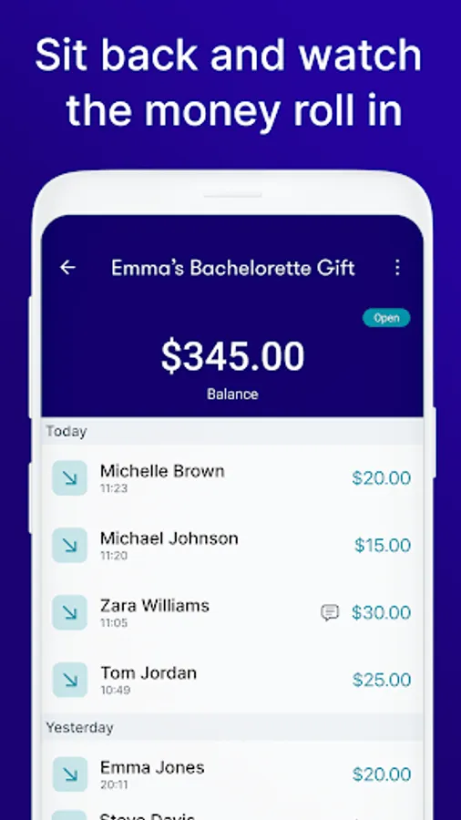 Need to collect for an ongoing group activity like a sports team? You’ll love our real-time balance updates as people pay into your money pool, and as you withdraw. Easily see how much is in the pool, how much you’ve ever collected, and a list of all the transactions.