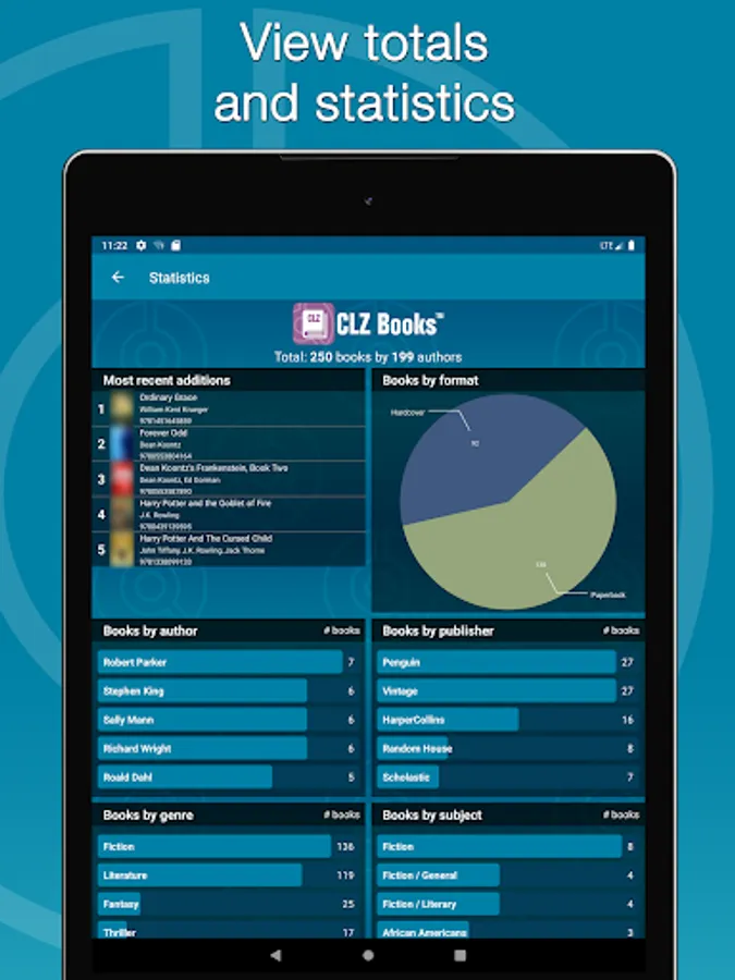 Total books and authors, most recent additions, charts by author, publisher, publication year, read it status, subject, genre and format.