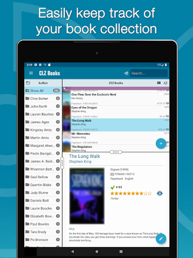 Sort by author, title, publication date, date added etc.. Group your books into folders by author, publisher, genre, subject, location, etc... Or just use the search box top right.
