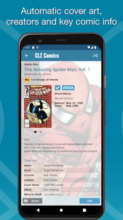 Our CLZ Core will automatically give you cover art and full comic details, like Series, Issue Nr, Publisher, plot, creator lists, character lists, backdrop art, etc...