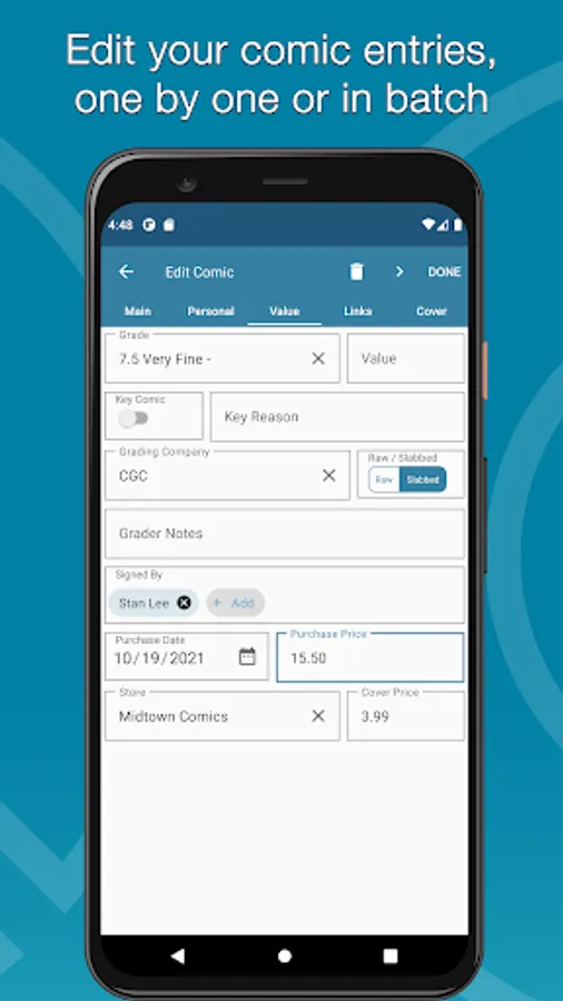 Like storage box, grade, signed by, purchase date / price / store, notes, etc.. Mark your key comics and enter the key reason (e.g. "first appearance of ...").