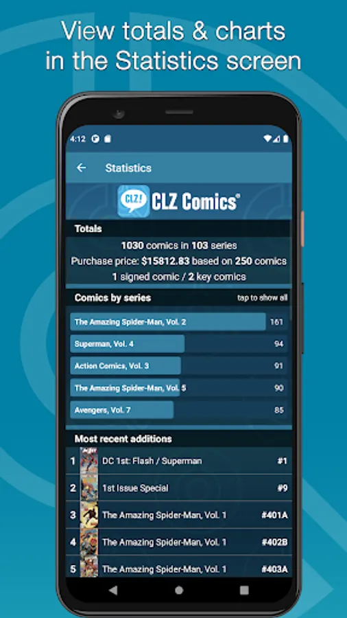 Total comics and series, most recent additions, charts by series, by publisher, by grade, etc..