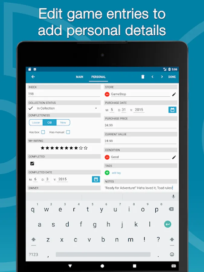 Set the Completeness status for your games (Loose, CIB or New) and instantly get game values from Pricecharting. Run the Update Values tool to get daily price updates.