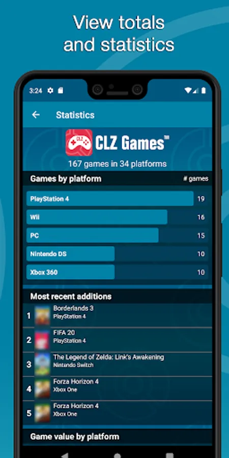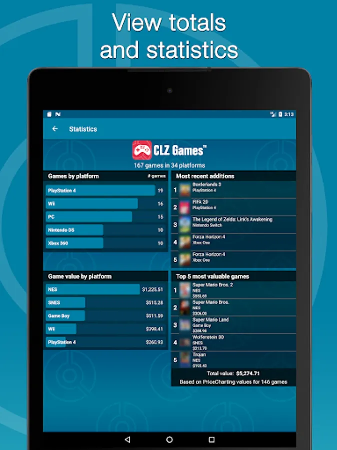 Totals for games and platforms, most recent additions, most valuable games, charts by platform, by year, by genre, by completeness, by completed (yes/no), etc..