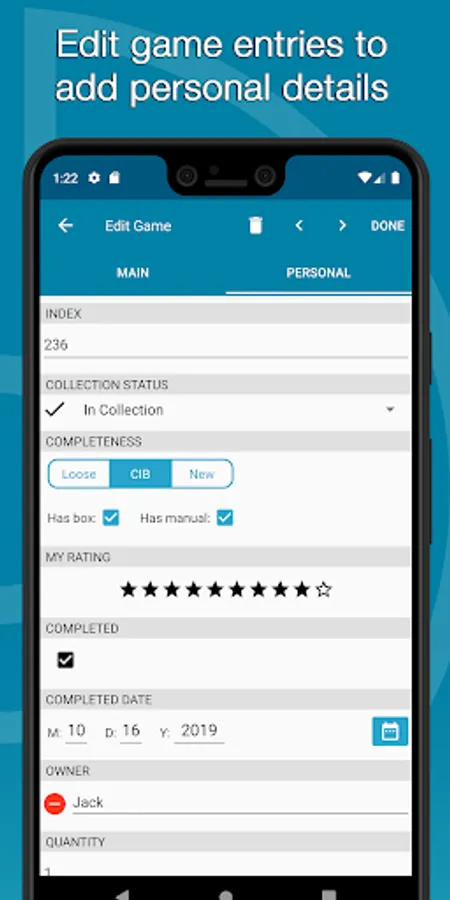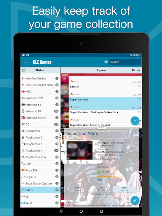 Organize all your video games, for any platform, modern or retro. Keep track of their values based on their Loose, CIB or New status.