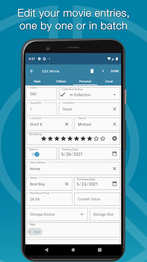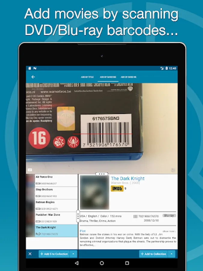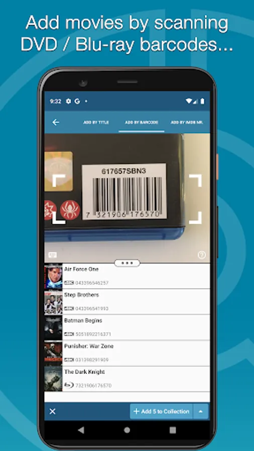 Catalog your 4K UHD, Blu-ray and DVD collection. Just scan their barcodes.
