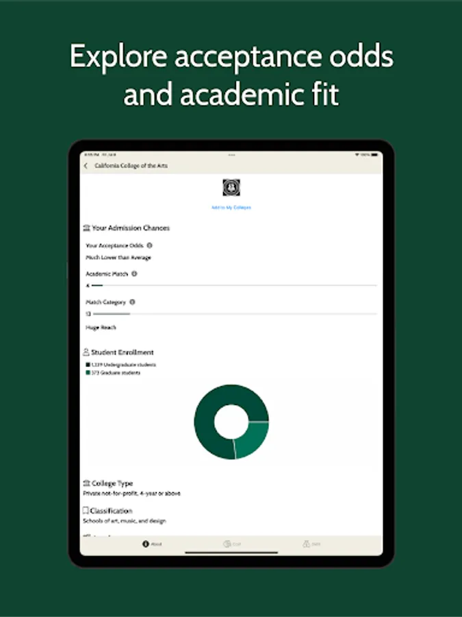 College Raptor is the easiest way to find out the true price of colleges. College Raptor gives students personalized scholarship estimates at any college based on their GPA, ACT and SAT scores and other factors unique to you. Discover schools that are likely to offer you huge financial aid and compare scholarship offers side by side in minutes. Note that this app is built for first-year, full-time "traditional" college students in the United States and not transfer students.