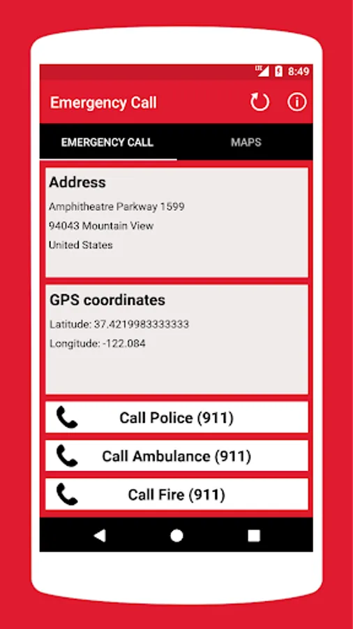 The Emergency Call app requires internet connection and access to the GPS receiver to work properly.