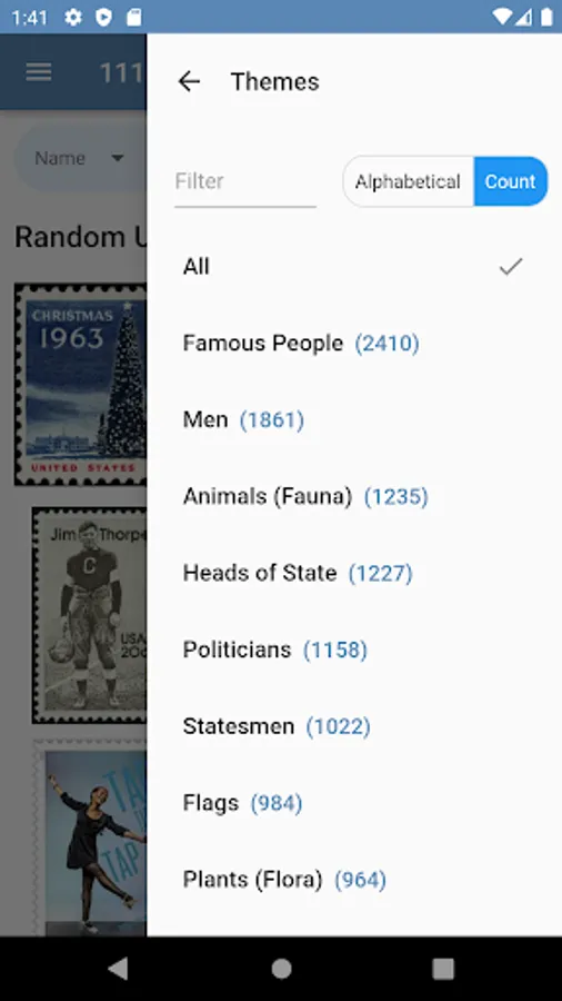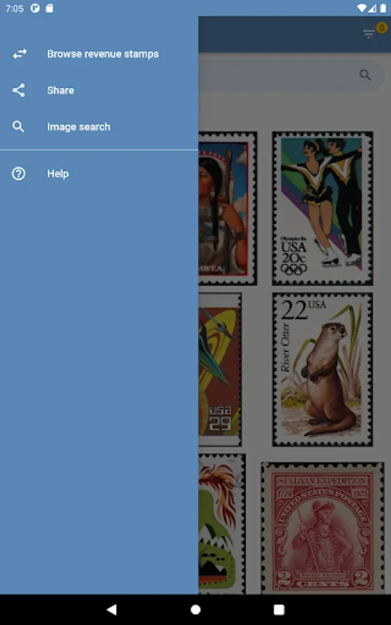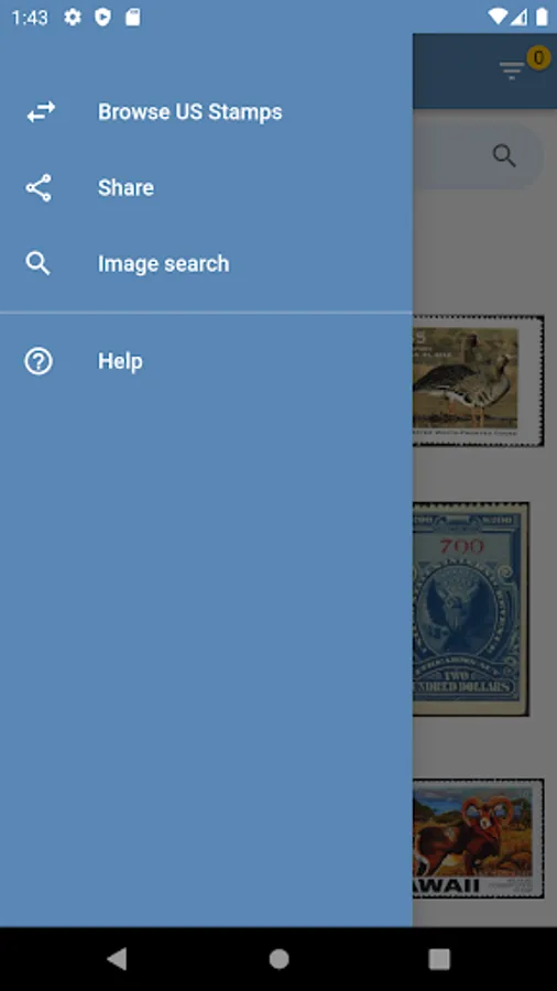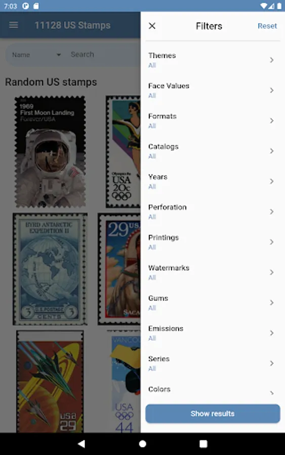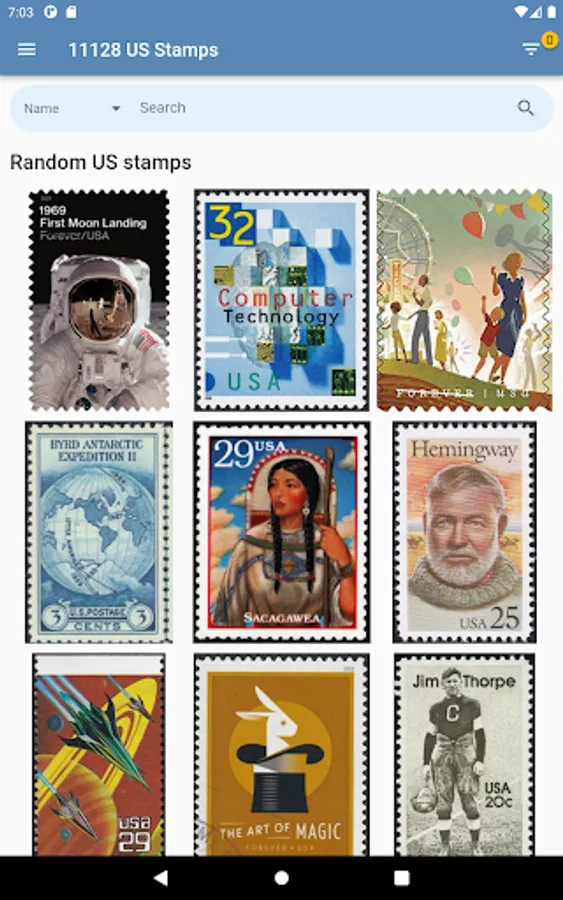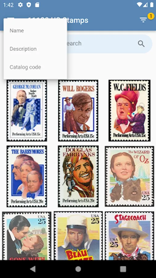 Search US stamps by Name, Description or Catalog Code by using a dropdown button in the search field
