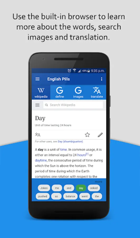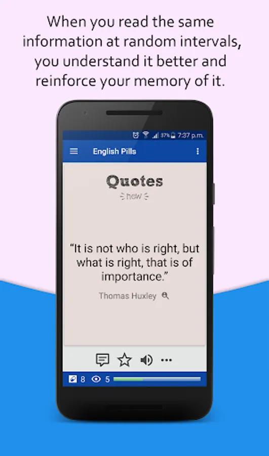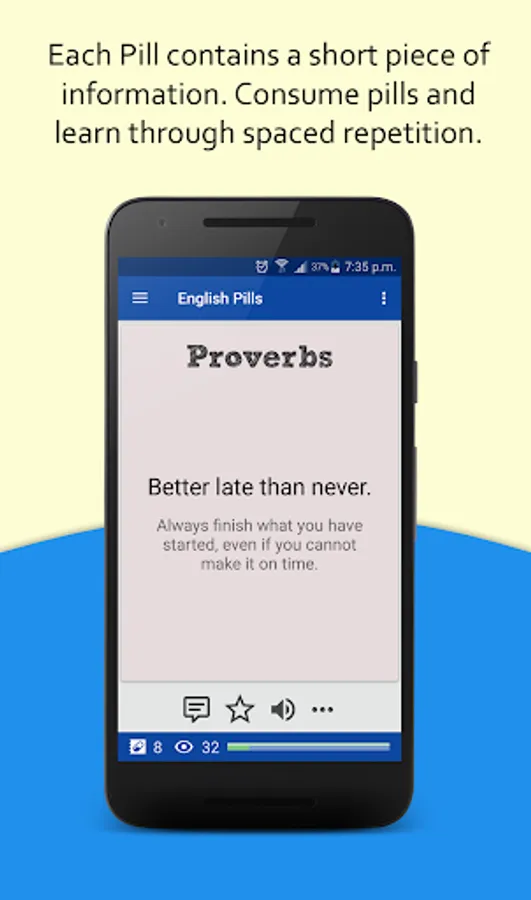 A common problem when you are learning a language is to remember the words you learned when you really need them. English Pill offers you the best way to learn a lot of vocabulary and useful information you don't find in the textbooks, using a technique called "spaced repetition".