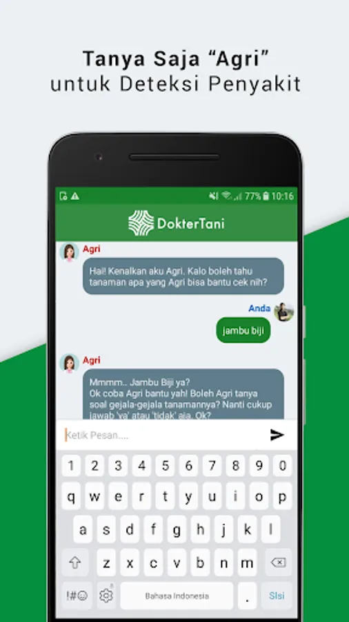 Chat is no longer a feature. Chat is a culture of the human digital era. In addition to the method of analysis according to symptoms. The application also provides chat-based online consulting services with our bot named "Agri". He is always there whenever you want to consult. Good morning, afternoon, night. Agri will help you track plant diseases.