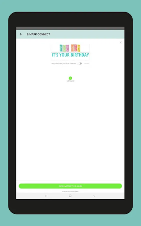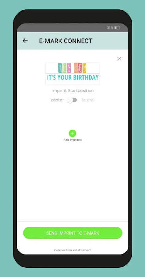 After your imprint design is finished, just send it to the e-mark via Wifi (no local WiFi needed; the WiFi is generated by the device itself) and print it with a simple sideways movement, either to the right or left. All generated imprints are stored in the app and can be sent to the e-mark in no time. Use the continual marking feature for repeating your imprint as long as you want.