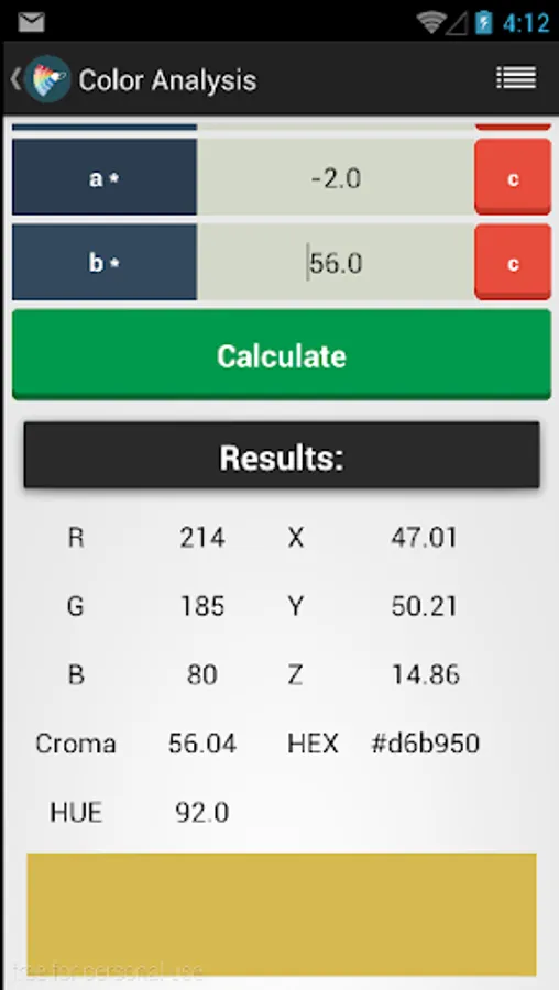 Chroma (C*) = 56.0 and HUE (Hº) = 92.0. (Our app)