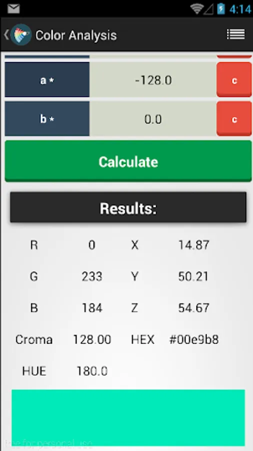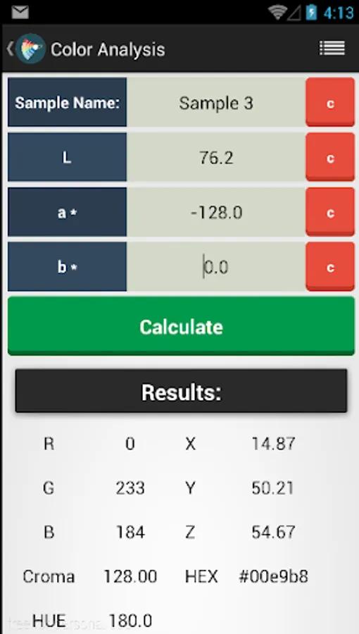 Also, convert colors spaces CIE La*b* values to C*, Hº, RGB, XYZ and #HEX!