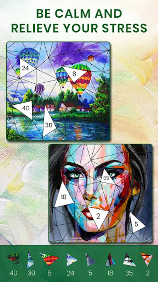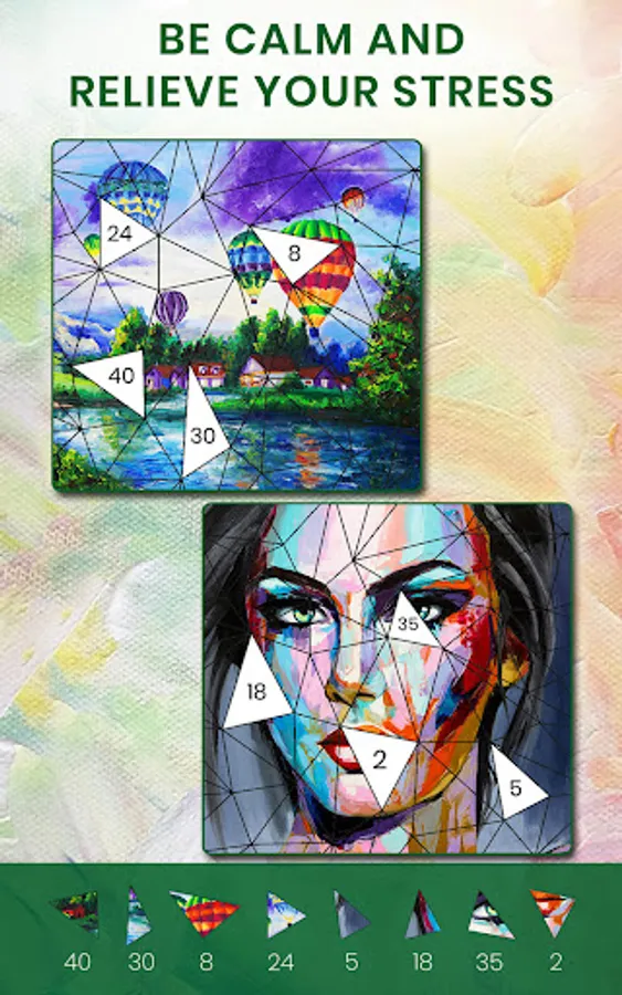This is the best coloring game for everyone and an excellent way to calm down, fun and relaxation. Oil paint art is not only a puzzle game to develop our recognition and steadiness, but also it can train concentration and steadiness.