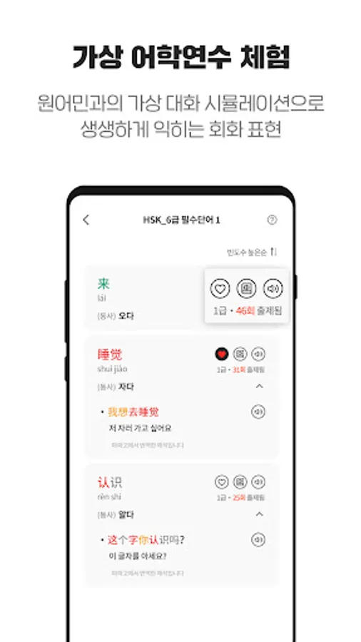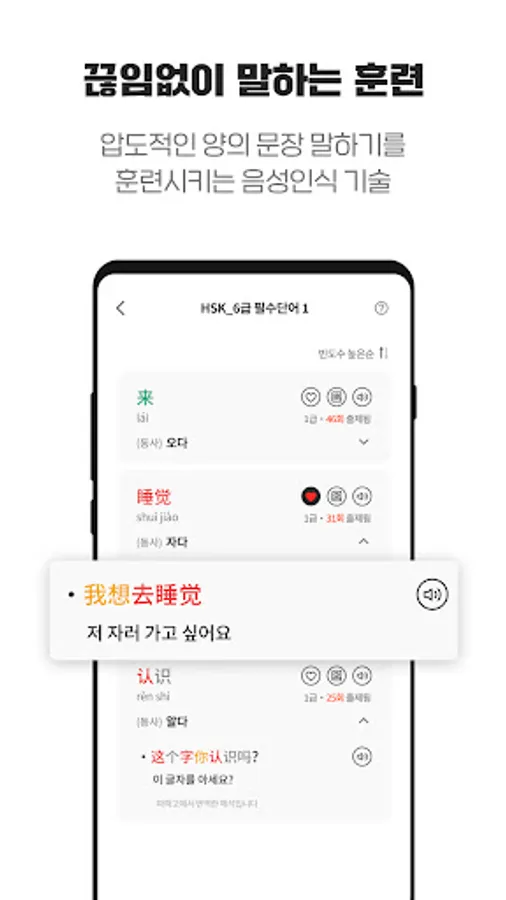 In the HSK written vocabulary, you can not only learn words, but also check examples of previous questions. If you select a word, you can even check the example sentences in the previous questions in which the word appeared. You can further improve memorization efficiency while learning words through example sentences from previous questions.