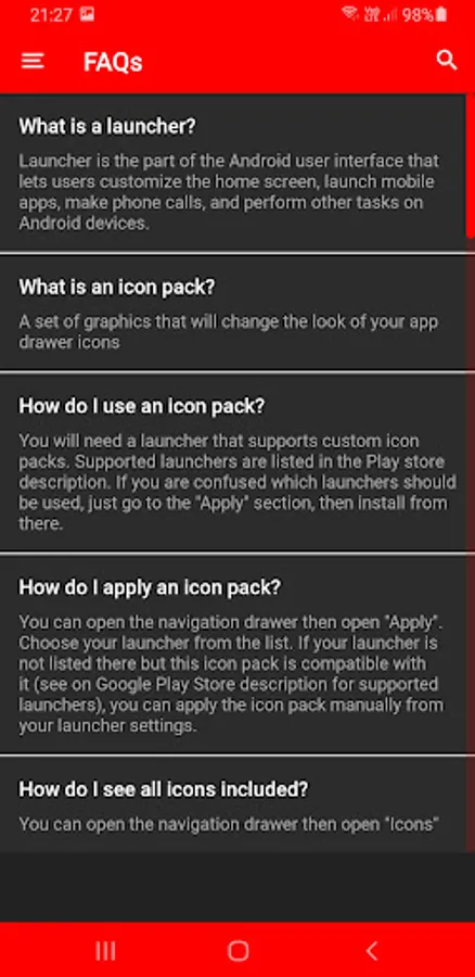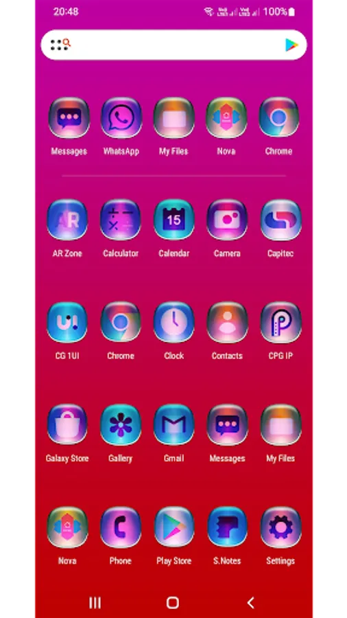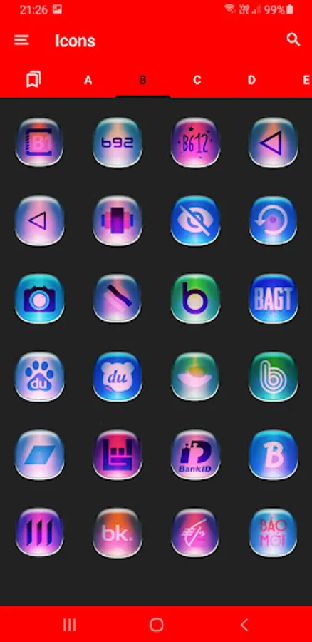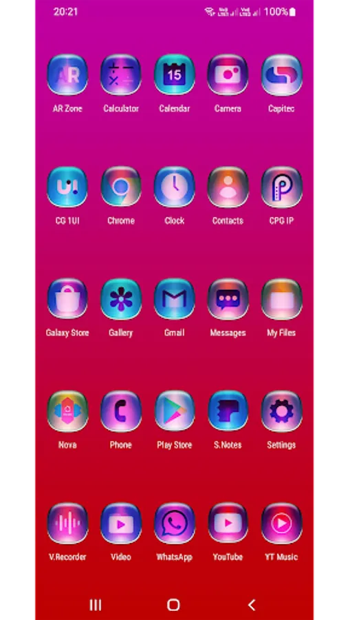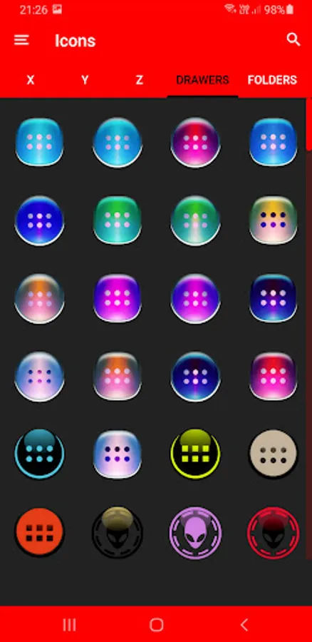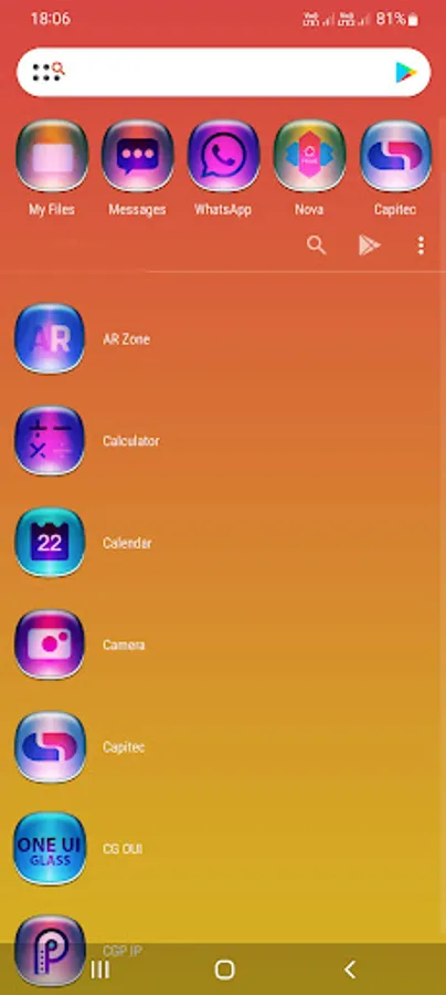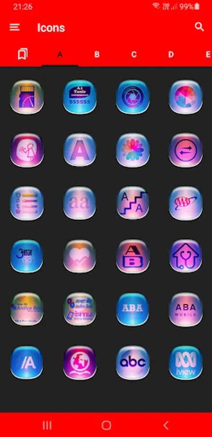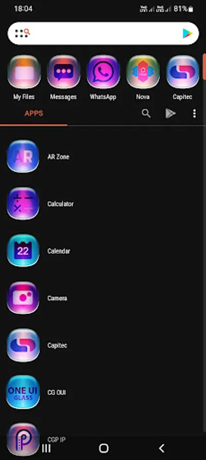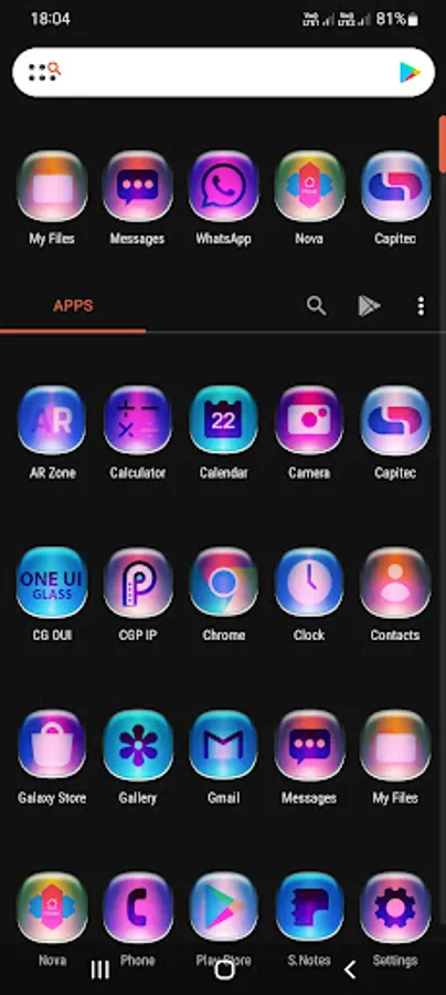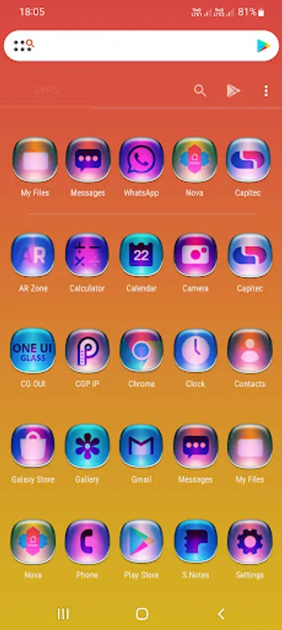 Icon Pack contains 5600+ HD ONE UI Glass Icons for mobile phones and tablets, Tap on "See More" at the bottom of the page or search for "Ronald Dwk" for more icon packs, there are over 300 icon packs both free & paid to choose from in different colors, shapes and designs. Enjoy