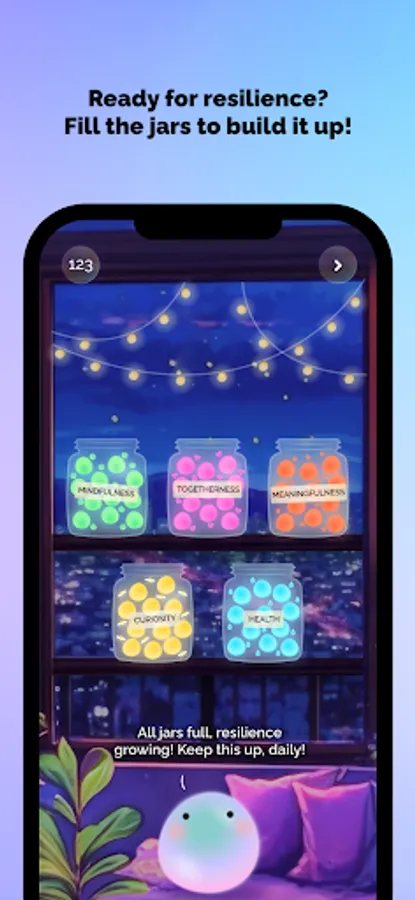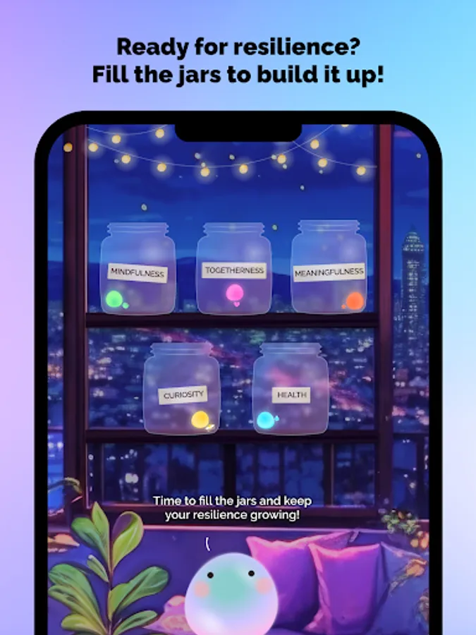 The state of your brain is mapped to five main jars: mindfulness, togetherness, meaningfulness, curiosity, and health! Fill these jars daily with little joys to help Joyi create sustainable happiness for you.