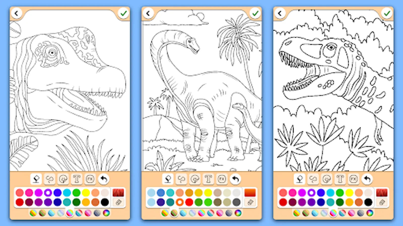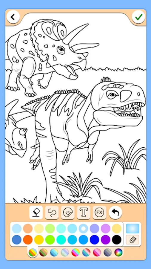 Free app for all dino fans with 200+ coloring pages of dinosaurs. Lots of designs with friendly herbivores, lovely mother dinos with their kids and fierce dino king like T Rex.