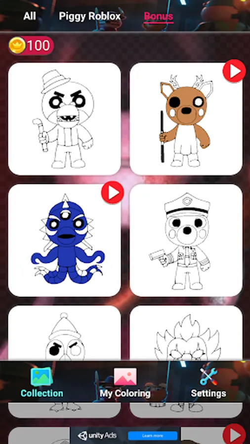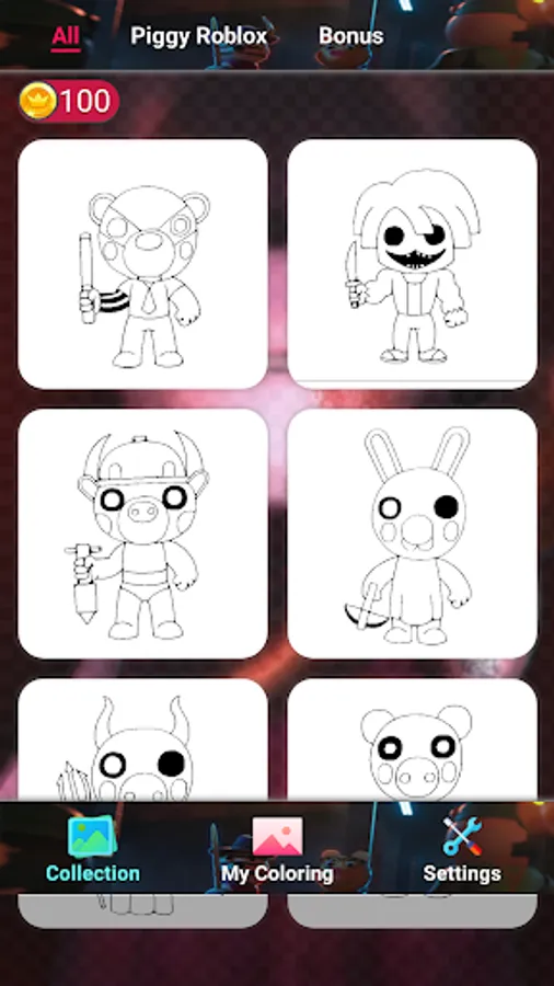 This is a coloring game for the famous mod of roblx, piggy and all the characters are waiting for your coloring ability with Kona, Willow, Clownly, Mr.P, Zizzy, Mimi, Mousy, and all others from roblx.
