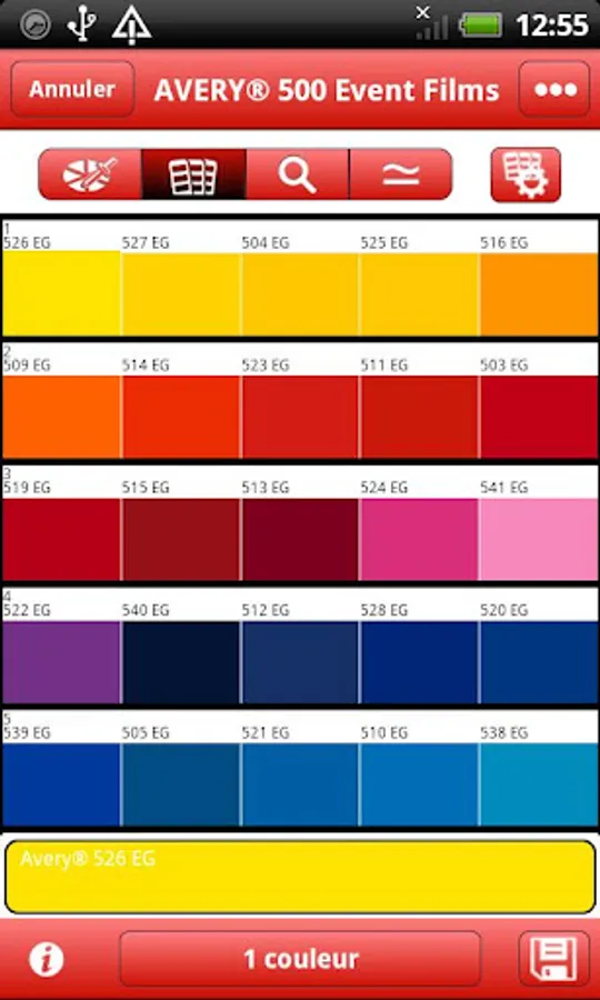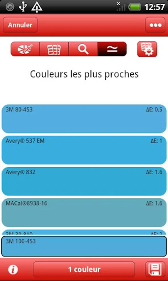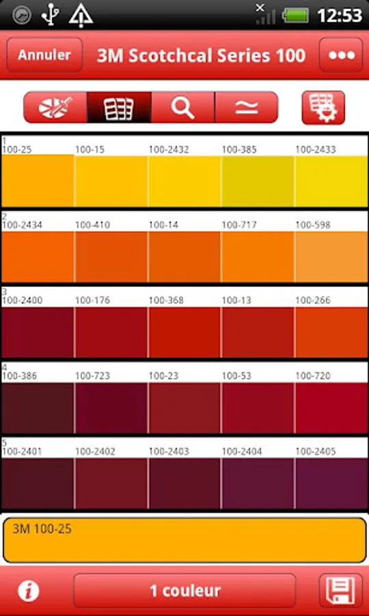 Selected colors (except metallics) shows up instantly on the screen of an Android device including its reference number and RGB values.