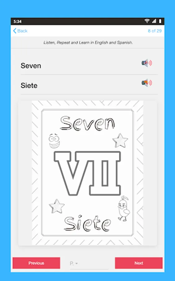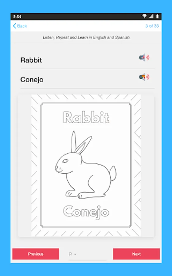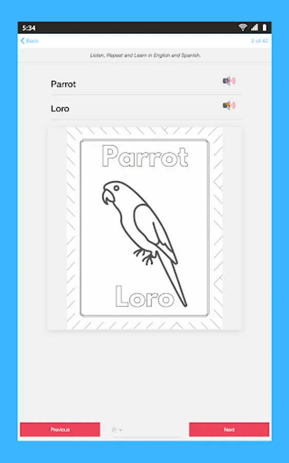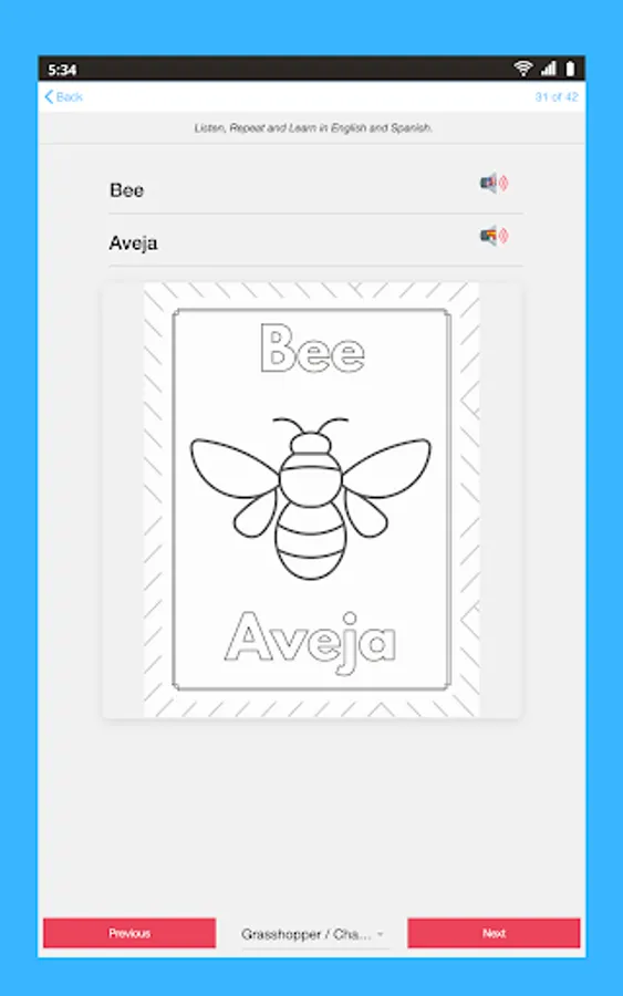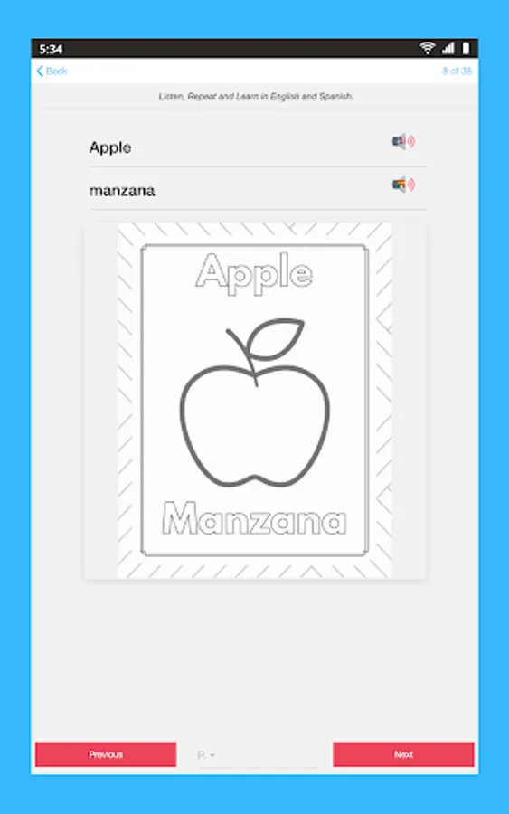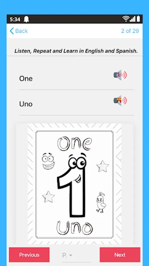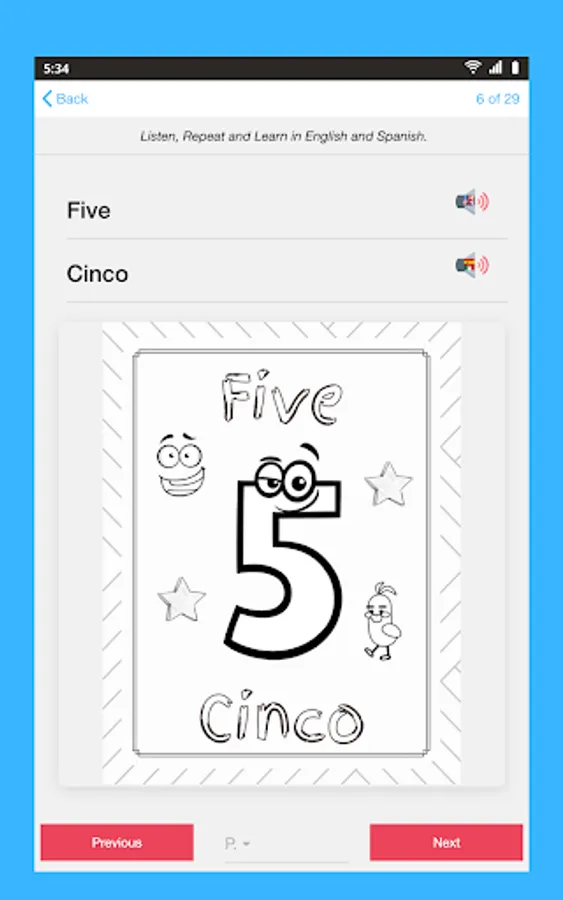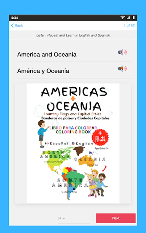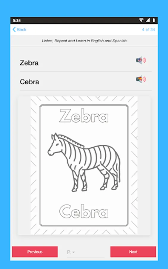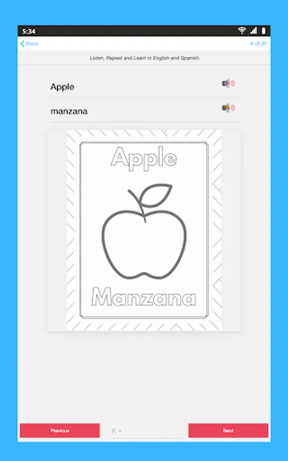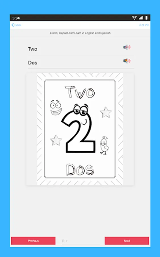 Have your little ones learn many things by coloring and listening in English and Spanish like animals, fruits, numbers, country flags, transportation, family description and many more.