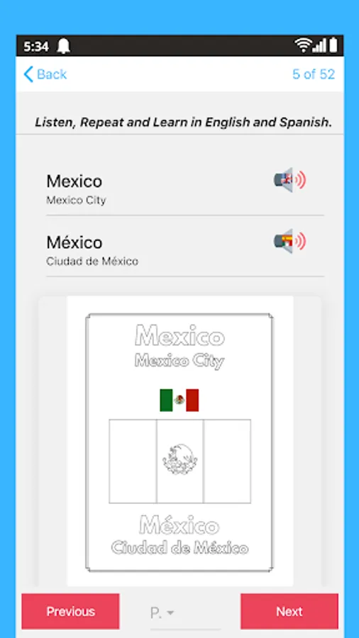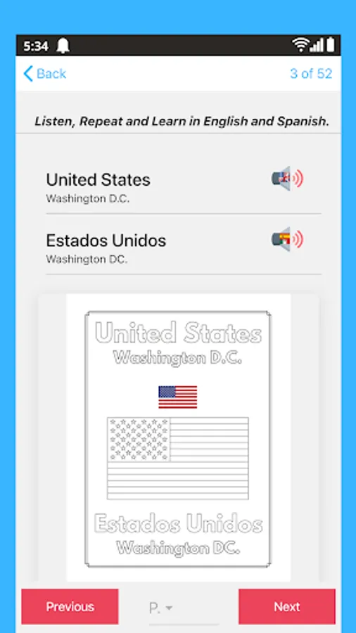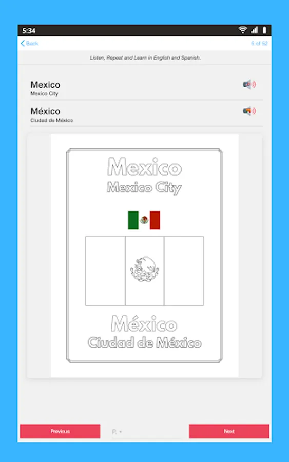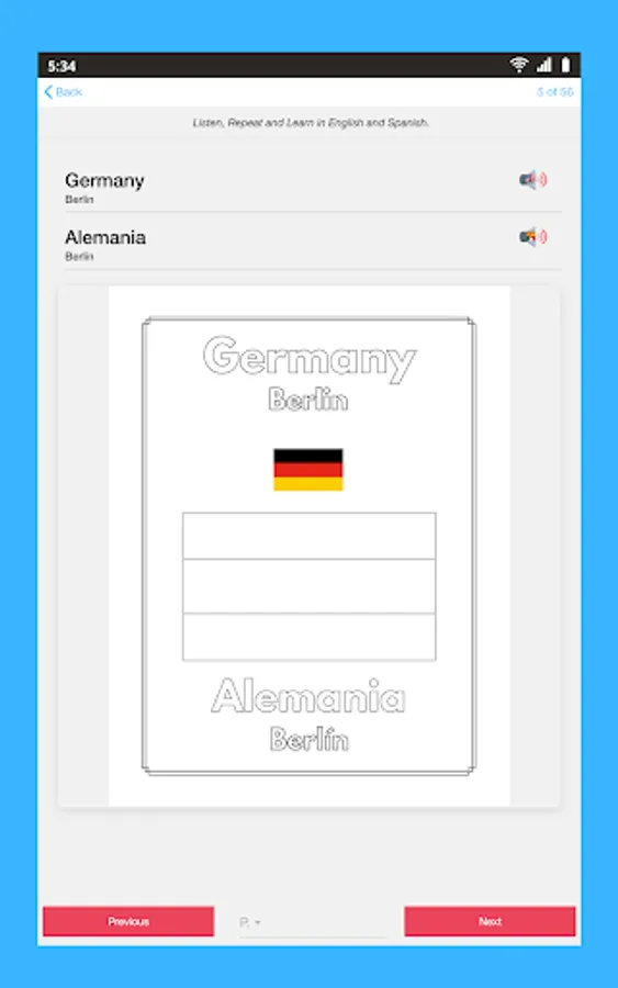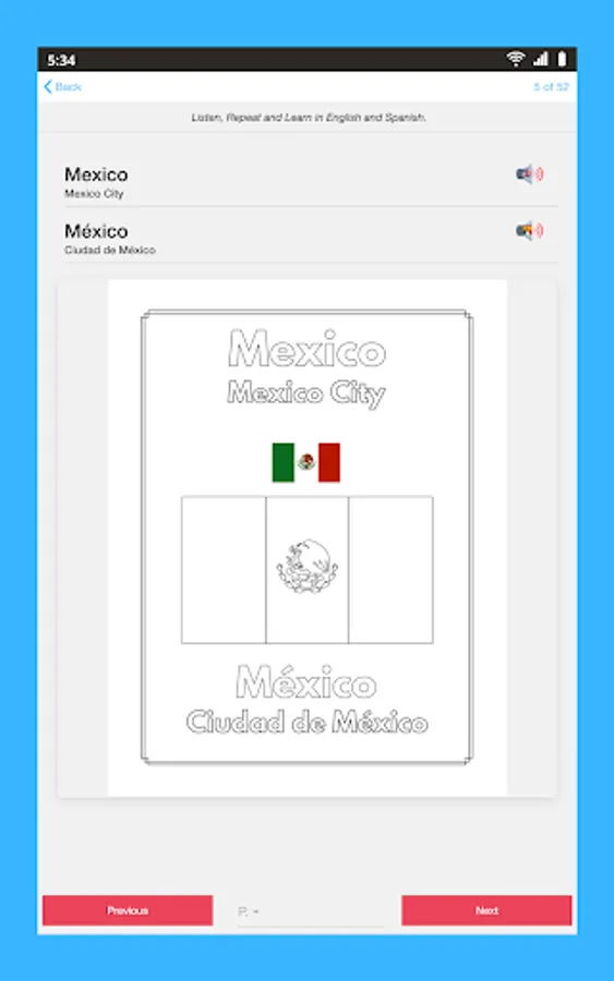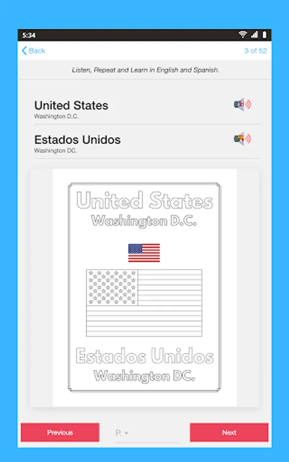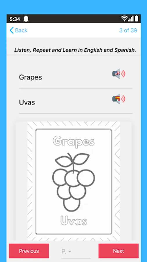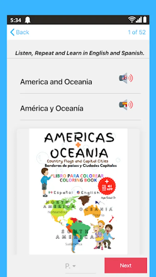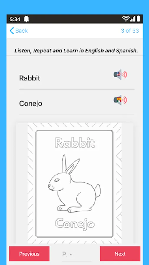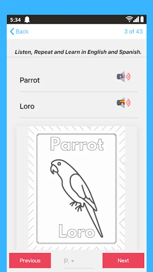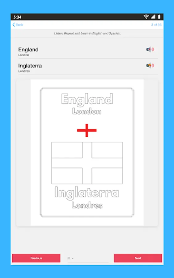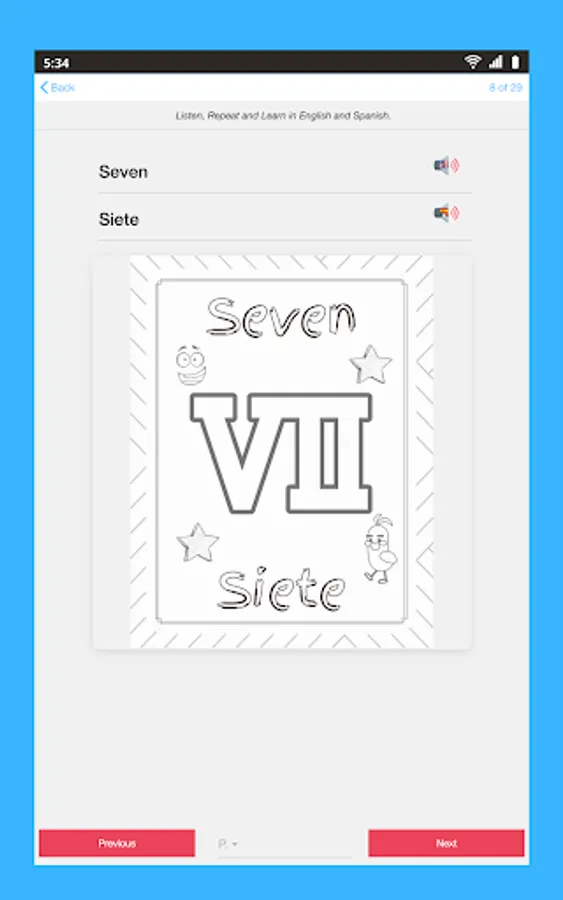Have your little ones learn many things by coloring and listening in English and Spanish like animals, fruits, numbers, country flags, transportation, family description and many more.